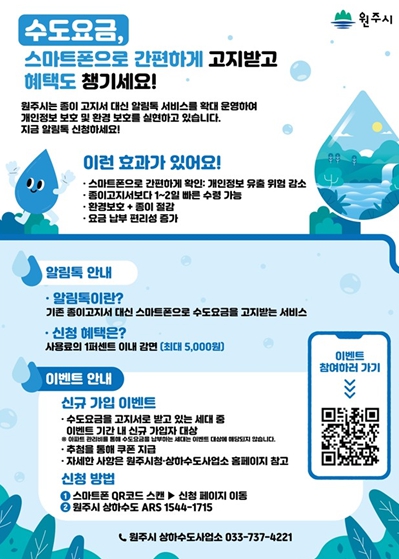 [뉴스다컴] 원주시상하수도사업소는 ‘수도요금 알림톡 서비스’ 확대를 위해 10월 1일부터 12월 7일까지 신규 가입 이벤트를 진행한다.