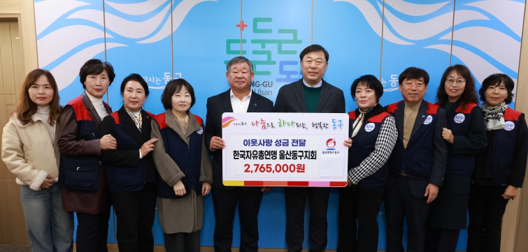[뉴스다컴] 한국자유총연맹 울산동구지회(회장 이병태)는 11월 24일 오전 11시 울산 동구청을 방문해 이웃돕기 성금 276만 5천 원을 전달했다.