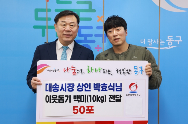 | ▲ 대송시장 NEW캐슬장터 박효식 대표는 28일 동구청을 방문해 대송동 저소득층을 지원해 달라며 200만원 상당의 쌀을 김종훈 동구청장에게 전달하고 있다. |