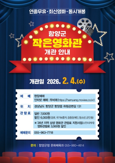 작은영화관 개관식은 오는 2월 12일 오전 11시 함양군 작은영화관 광장에서 개최될 예정이다.