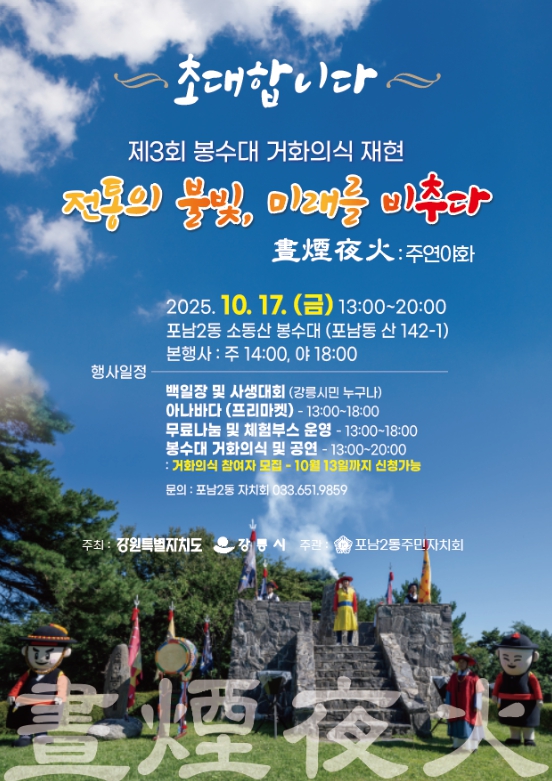 [뉴스다컴] 옛날 외적의 침입 등 위급 상황을 알리기 위해 낮에는 연기를, 밤에는 불을 올리던 주연야화(晝煙夜火), “제3회 소동산 봉수대 거화의식” 재현 행사가 오는 17일 금요일 소동산 봉수대(포남동 산142-1) 일원에서 열린다.