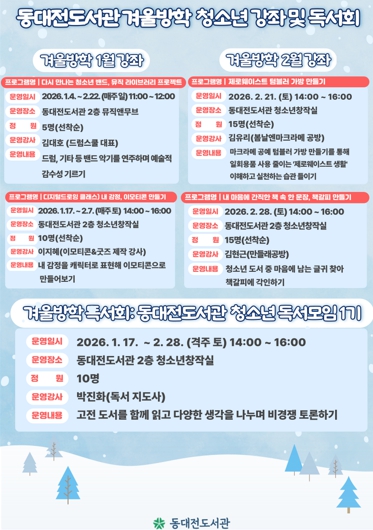 [뉴스다컴] 동대전도서관은 겨울방학을 맞아 오는 1월 4일부터 2월 28일까지 청소년을 대상으로 독서회 및 창작 체험 강좌를 운영한다.