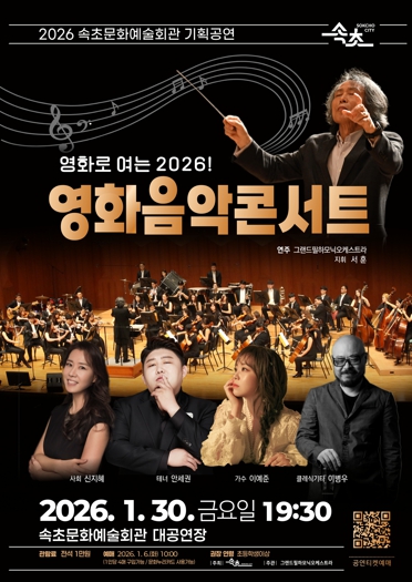 [뉴스다컴] 속초시가 2026년 새해를 맞아 1월 30일 오후 7시 30분, 속초문화예술회관 대공연장에서 ‘영화로 여는 2026! 영화음악콘서트’를 개최한다.