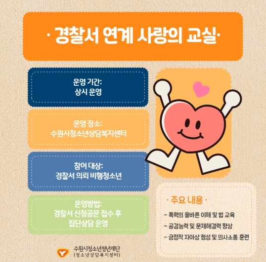 [뉴스다컴] 수원시청소년청년재단 수원시청소년상담복지센터는 수원영통경찰서와 수원팔달경찰서에서 의뢰된 비행청소년을 대상으로 ‘사랑의 교실’프로그램을 연중 운영하고 있다.