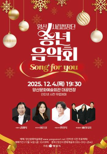 [뉴스다컴] 양산시는 12월 4일 저녁 7시 30분부터 90분간 양산문화예술회관 대공연장에서 양산시립합창단 송년음악회 ‘Song for you’를 개최한다.
