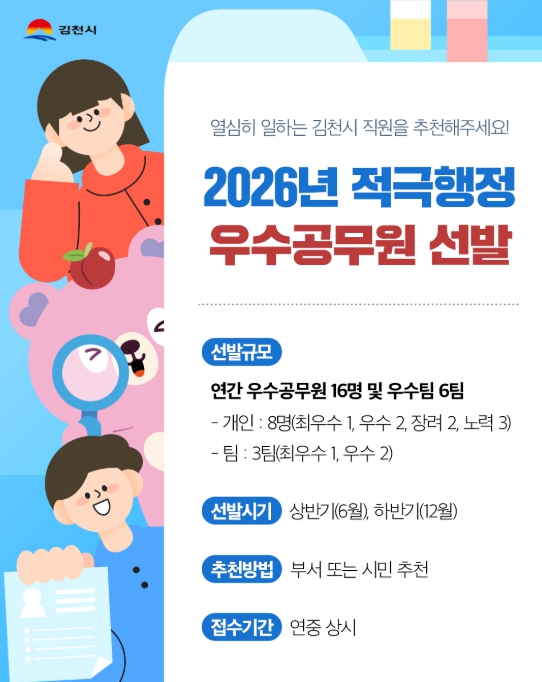 [뉴스다컴] 김천시는 행정서비스 향상과 공익 증진, 사회문제 해결을 위해 2026년도 적극행정 우수공무원을 선발한다고 밝혔다.