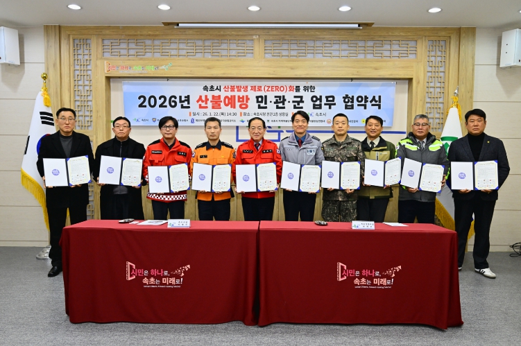시는 1월 22일, 시청 상황실에서 10개 기관·단체가 참여한 가운데‘2026년 산불 예방 민·관·군 업무협약’을 체결했다. 협약은 속초시가 주최했으며, 속초경찰서·속초소방서·양양국유림관리소·설악산국립공원사무소·제22보병사단·지역자율방재단·자율방범대·의용소방대·통장연합회가 참여해 뜻을 모았다.