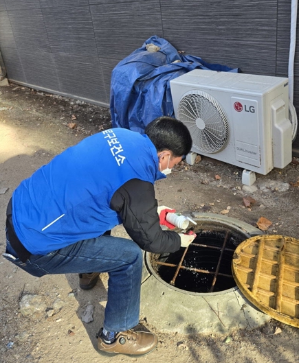 | ▲ 동절기 모기 유충 선제 차단을 위한 유충구제제 투여 작업을 하고 있다. |