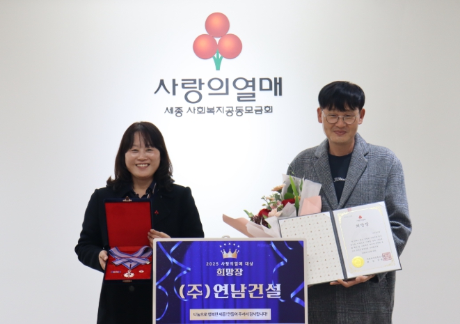 [뉴스다컴] ㈜연남건설(대표 박성윤)은 사회복지공동모금회가 주최하는 ‘2025년 제12회 사랑의열매 대상’에서 기부분야 ‘희망장’을 수여해 전달식을 가졌다고 세종사회복지공동모금회(회장 박상혁)에서 전했다.