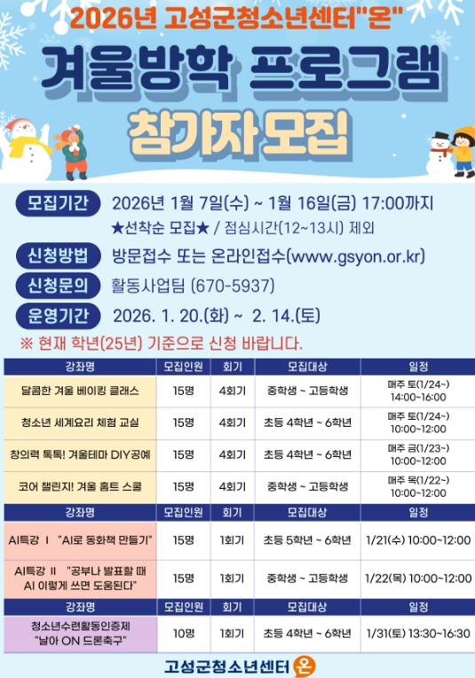 [뉴스다컴] 고성군청소년센터“온”은 겨울방학을 맞이한 관내 청소년들을 대상으로 2026년 1월 20일부터 2월 14일까지 2026년 겨울방학 프로그램 및 특강을 운영한다.