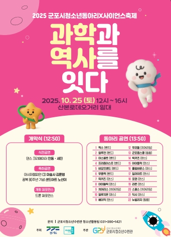 [뉴스다컴] (재)군포시청소년재단 산하 군포시청소년수련관은 오는 10월 25일 12시부터 16시까지 산본로데오거리 일대에서 2025 군포시청소년동아리X사이언스축제 ‘과학과 역사를 잇다’를 펼친다. 청소년들에게 공연과 과학, 역사 체험의 기회를 제공하고 지역사회의 참여를 끌어내겠다는 취지이다.