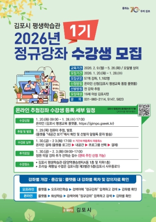 [뉴스다컴] 김포시 평생학습관은 시민의 지속적인 평생학습 참여와 자기계발을 지원하기 위해 ‘2026년 제1기 평생학습관 정규강좌’ 수강생을 모집한다.