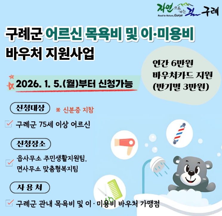 [뉴스다컴] 구례군은 75세 이상 어르신들의 건강하고 활기찬 노후생활 보장과 지역경제 활성화를 도모하기 위해 '어르신 목욕비 및 이·미용비 바우처 지원사업'을 본격 추진한다고 밝혔다.