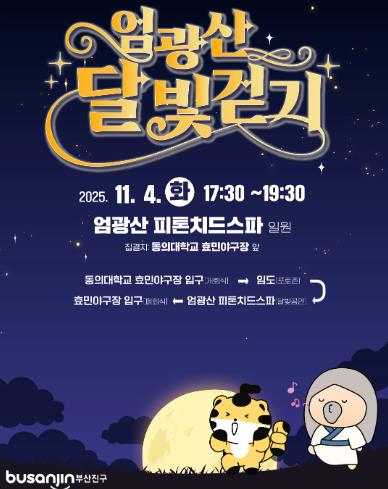 [뉴스다컴] 부산 부산진구는 오는 11월 4일 오후 5시 30분에 동의대학교 효민야구장 앞에서 자연환경과 음악·퍼포먼스가 어우러진 엄광산 달빛걷기 행사를 개최한다고 밝혔다.