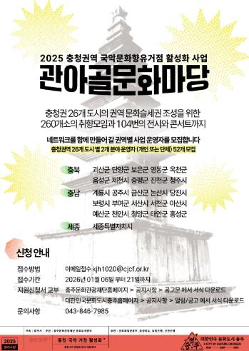 [뉴스다컴] 충주문화관광재단과 충주시는 정부의 지방시대 핵심 비전인 ‘5극 3특(5대 초광역권 및 3대 특별자치도)’ 전략에 발맞춰, 충청권역의 문화적 연대를 강화하고 지역 균형 성장을 견인할 '충청권 국악문화향유거점 활성화 사업' 운영자를 오는 21일까지 공개 모집한다.