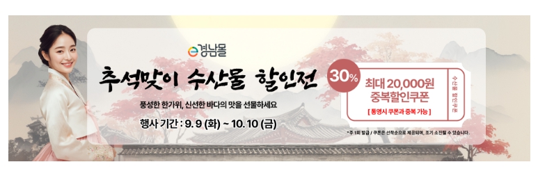 [뉴스다컴] 경상남도는 추석 명절, 도내 우수 수산물 소비를 촉진하고 어업인 소득을 높이기 위해 온오프라인 소비 촉진 행사를 개최한다. 이번 행사는 온라인몰 특별 할인 기획전과 전통시장 온누리 상품권 환급행사를 중심으로 진행하며, 다채로운 혜택을 제공한다.