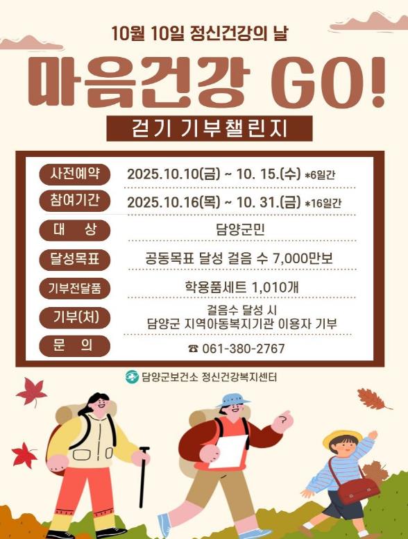 [뉴스다컴] 담양군은 10월 10일 ‘세계 정신건강의 날’을 맞이하여 전 군민을 대상으로 걷기 기부 챌린지를 운영한다고 밝혔다.