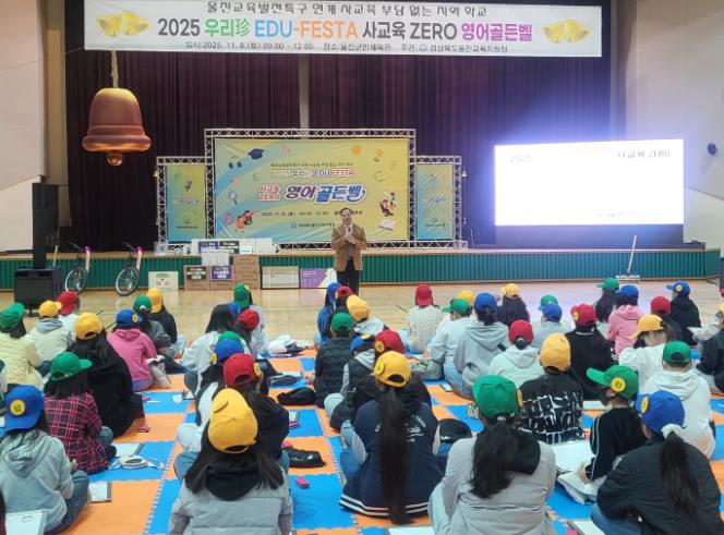 [뉴스다컴] 울진교육지원청은 11월 8일 오전 9시, 울진군민체육관에서 울진 관내 초등학생 5~6학년 100여명을 대상으로 '2025 우리珍 에듀 페스타 ‘사교육 ZERO 영어골든벨’'을 개최했다.