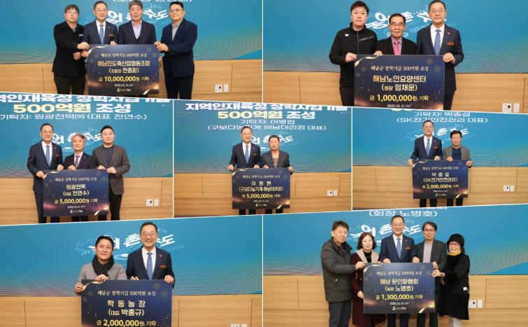 구보다농기계 해남대리점 이병현 대표와 SK전기안전관리 박종섭 대표도 각각 500만원, 200만원을 기탁하며“지역사회에서 사업을 하며, 언제나 지역에 되갚고자 하는 마음이었으나, 이제야 실천하게 됐다”고 지속 참여 의사를 밝혔다.