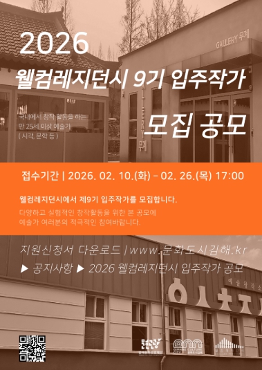 [뉴스다컴] (재)김해문화관광재단(대표이사 최석철) 김해문화도시센터는 오는 10일부터 26일까지‘2026 웰컴레지던시 제9기 입주작가’를 모집한다.