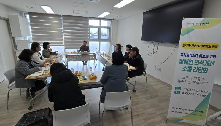 [뉴스다컴] 울산 중구지역사회보장협의체 장애인분과가 11월 26일 오전 11시 울산장애인통합지원센터 교육실에서 ‘복지사각지대 해소를 위한 장애인 인식 개선 소통 간담회’를 개최했다.