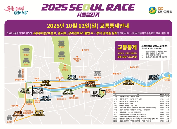 대회 당일인 12일 오전 6시부터 11시 40분까지 남대문로~을지로~청계천로 등 주요 구간별 교통이 통제된다. 다만 시는 대회 참가자 전원이 해당 통제 구간을 통과하면 순차적으로 통제를 해제해 시민 불편을 최소화할 예정이다.