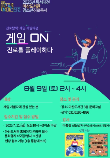 [뉴스다컴] 김포시 마산도서관은 청소년 진로독서프로그램 ‘게임 온(ON): 진로를 플레이하다’를 8월 9일 오후 2시부터 4시까지 마산도서관 3층 문화교실에서 운영한다.
