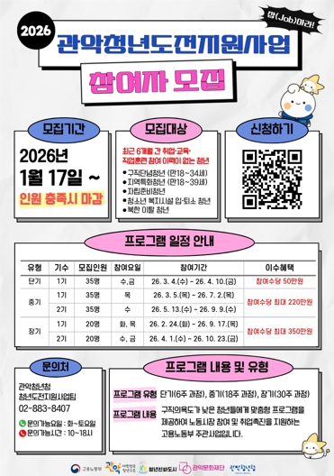 [뉴스다컴] 관악구가 구직을 단념한 청년들의 사회 진입을 돕기 위해 오는 1월 17일부터 ‘2026년 청년도전지원사업’ 참여자를 모집한다.