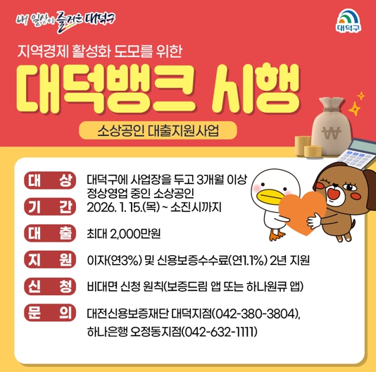 [뉴스다컴] 대전 대덕구는 경기침체로 자금 운용에 어려움을 겪는 지역 소상공인의 금융 부담을 완화하기 위해 소상공인 대출지원사업 ‘2026 대덕뱅크’를 시행한다.