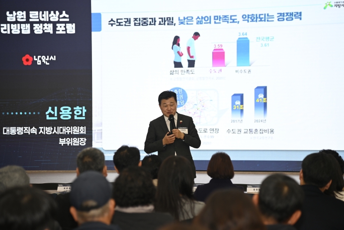 [뉴스다컴] 남원시는 11일 시청 강당에서 ‘남원 르네상스 리빙랩 정책포럼’을 개최하고, 국가 균형발전 전략인 ‘5극 3특’ 정책 기조에 맞춘 남원형 생활인구 확대 전략과 지속 가능한 남원시 활력 제고 방안을 논의했다.
