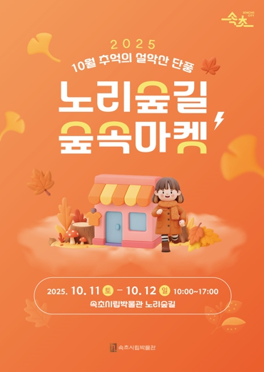 [뉴스다컴] 속초시립박물관이 2025년 10월 11일부터 12일까지 오전 10시부터 오후 5시까지 박물관과 노리숲길 일원에서 ‘2025년 10월 노리숲길 숲속마켓’을 연다. 입장료는 무료다.