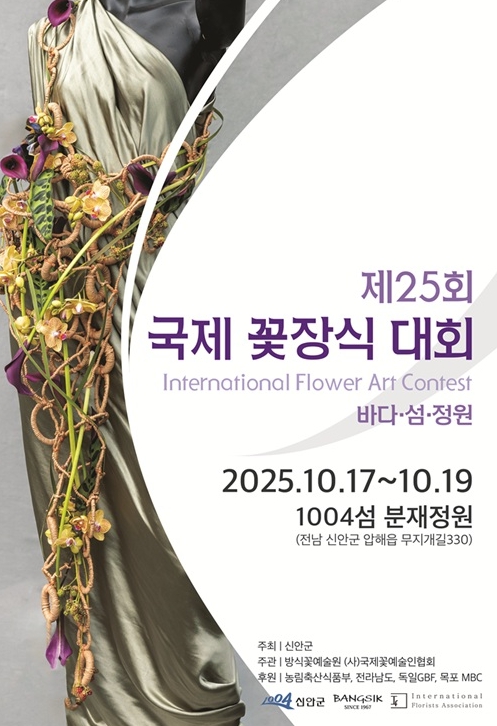 [뉴스다컴] 대한민국 K-플라워 예술의 중심으로 떠오르는 신안군에서 ‘제25회 국제꽃장식대회’가 오는 10월 17일부터 19일까지 3일간 압해읍 1004섬 분재정원에서 개최된다.