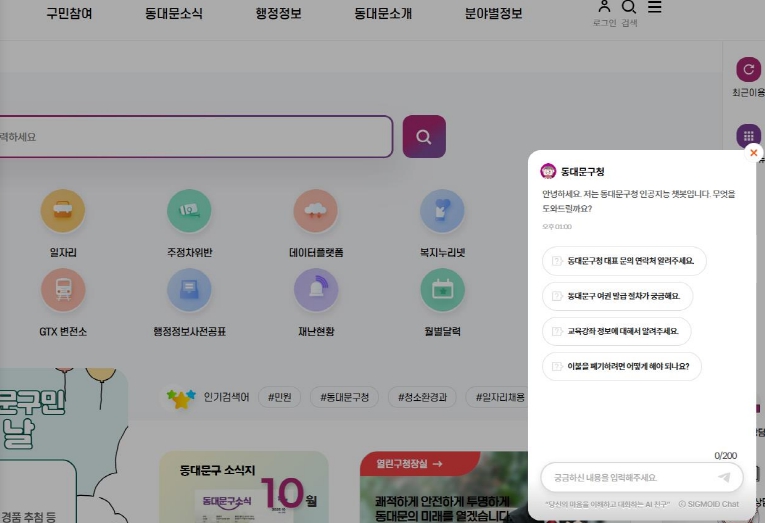 ▲ 동대문구 누리집 ‘챗봇 서비스’ 화면 |