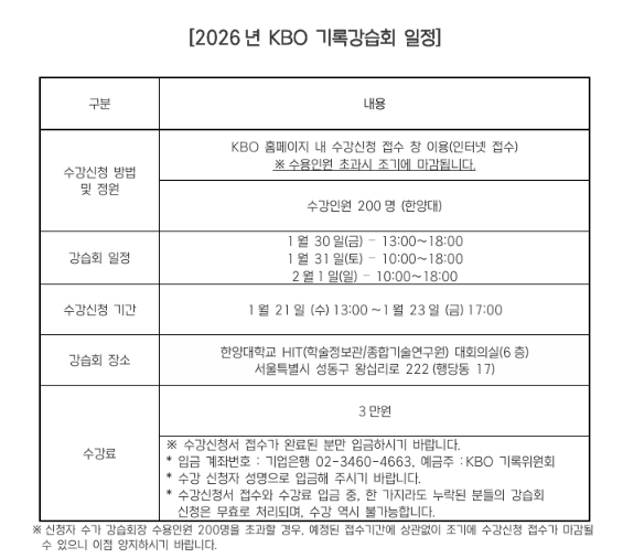 [뉴스다컴] 2026년 KBO 기록강습회가 1월 30일(금)부터 2월 1일(일)까지 서울 한양대학교에서 개최된다. 기록강습회는 야구 공식기록법의 보급과 이해를 통한 저변 확대를 목적으로 프로야구 원년인 1982년부터 개최됐다.