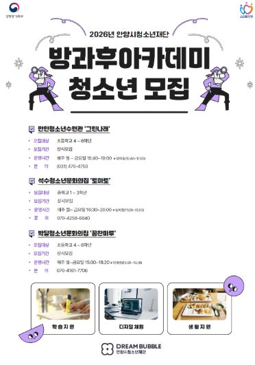 [뉴스다컴] 안양시청소년재단은 공공 청소년 돌봄 사업인 청소년방과후아카데미의 2026년도 참여 청소년을 모집한다.