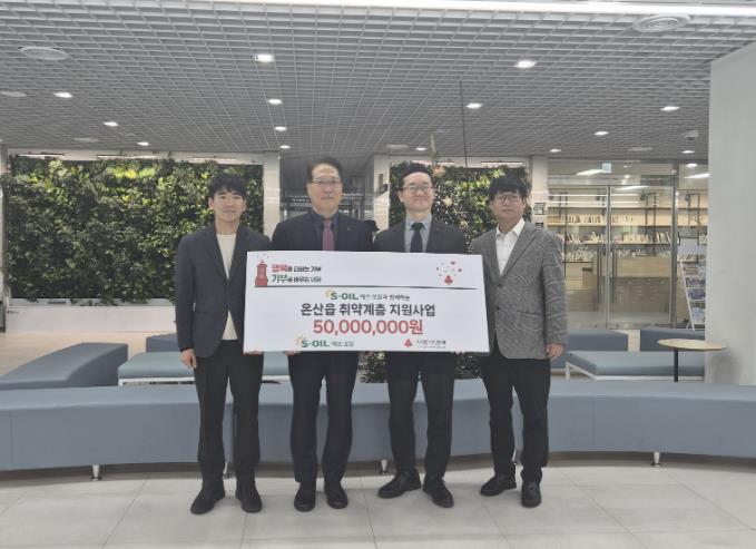 [뉴스다컴] S-OIL 울산공장이 5일 울주군 온산읍 행정복지센터에서 이준호 온산읍장, 박성훈 S-OIL 상무, 박광철 온산읍 지역사회보장협의체 위원장, 양호영 울산사회복지공동모금회 사무처장 등이 참석한 가운데 온산읍 취약계층 지원금 5천만원을 전달했다.