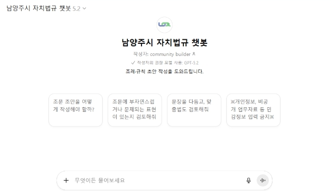 ‘남양주시 자치법규 챗봇’은 생성형 AI 기술을 기반으로 법제처의 입안 지침, 사례, 문장 정비 기준, 쟁점별 해석 자료 등을 학습해 △조문 작성 △문장 검수 △입법례 제공 등 실무에 필요한 다양한 기능을 수행한다. 특히 공유재산, 보조금, 위원회 등 행정 일반 분야 중심으로 자치법규 초안을 구성할 수 있도록 대화형 서비스를 지원한다.