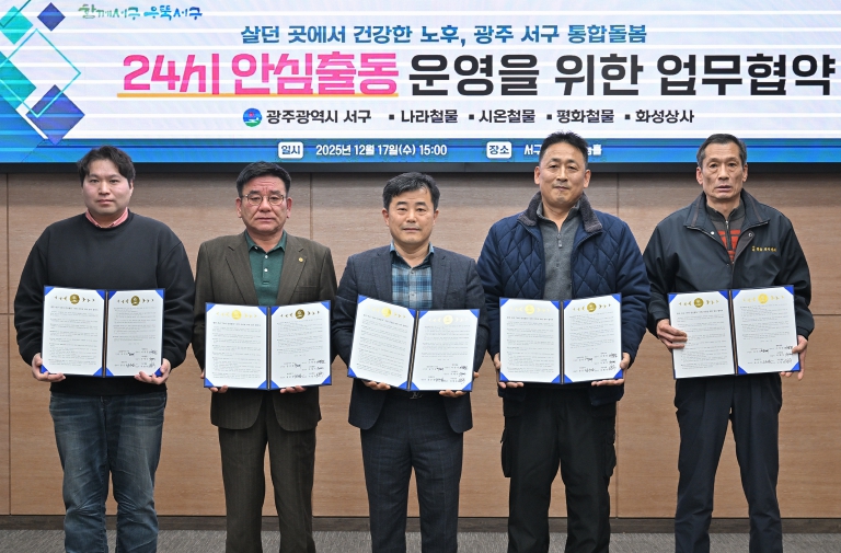 [뉴스다컴] 광주광역시 서구가 주민 일상 속 불편을 신속하게 해소하기 위해 팔을 걷어붙였다. 서구는 17일 서구청 나눔홀에서 관내 착한가게 4곳과 함께 ‘24시 안심출동’ 사업의 안정적 운영을 위한 업무협약을 맺고 빈틈없는 돌봄 서비스 제공에 협력하기로 했다. 이날 협약식에는 김성배 부구청장을 비롯해 윤순섭 화성상사 대표, 이영일 평화철물 대표, 주재식 나라철물 대표, 이영주 시온철물 대표가 참석했다. 이 업체들은 매월 정기 기부로 나눔을 실천하는 ‘착한가게’로 이웃돌봄 역할에도 적극적으로 참여하고 싶다는 뜻을 밝혔다.
