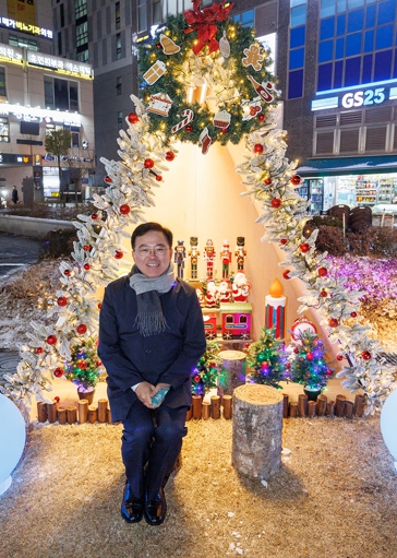 | ▲ 진교훈 서울 강서구청장이 발산역 1번 출구 앞 광장에 조성된 ‘마곡 위시빌리지’ 점등식을 찾아 크리스마스 조형물 앞에서 기념사진을 찍고 있다. |