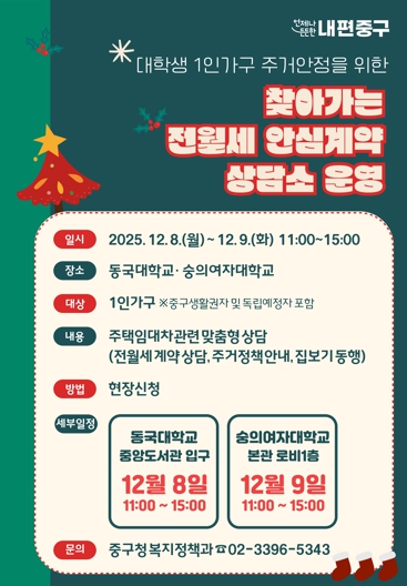[뉴스다컴] 서울 중구가 12월 8일과 9일에 동국대학교와 숭의여자대학교에서 대학생 1인 가구의 전월세 계약에 대한 불안과 부담을 덜어줄‘찾아가는 전월세 안심계약 상담소’를 운영한다. 지난 6월에 이은 두 번째 방문이다.