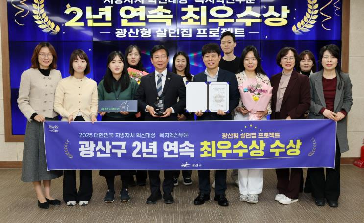 [뉴스다컴] 광주 광산구 ‘살던집 프로젝트’가 ‘대한민국 주거복지문화대상’ 종합대상에 이어 ‘2025 대한민국 지방자치 혁신대상’ 최우수상에 선정되며, 복지 혁신 평가 ‘2관왕’에 올랐다.
