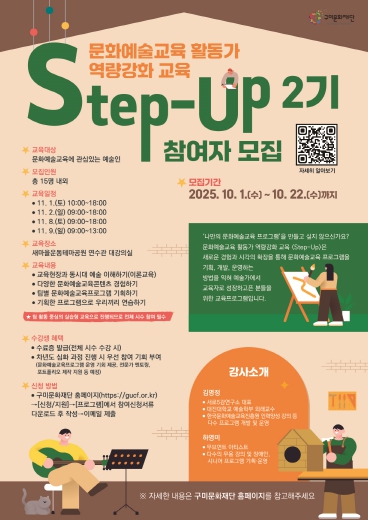 [뉴스다컴] (재)구미문화재단은 문화예술교육 활동가 역량강화 교육 프로그램 'Step-Up' 2기 참여자를 오는 10월 1일부터 22일까지 모집한다고 밝혔다.