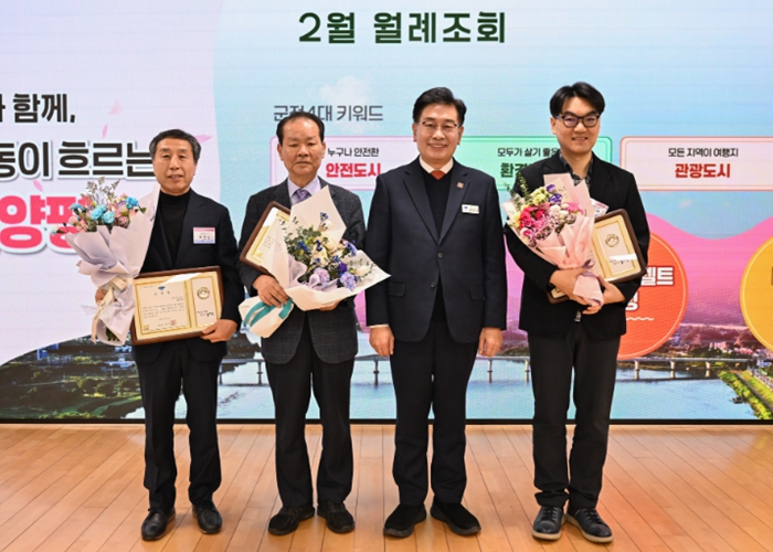 [뉴스다컴] 양평군은 2일 군청 대회의실에서 열린 2월 중 월례조회에서 일상 속 위급한 상황에서 이웃의 생명과 안전을 지킨 선행 군민 3명에게 표창을 수여했다.