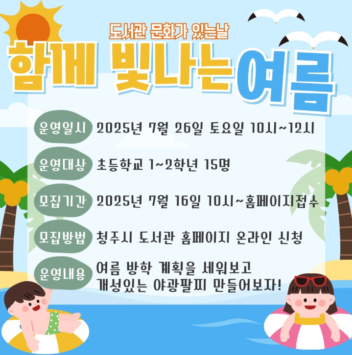 [뉴스다컴] 청주청원도서관은 오는 16일 오전 10시부터 7월 문화가 있는 날 프로그램 ‘함께 빛나는 여름, 야광 팔찌 만들기’ 수강생을 모집한다.