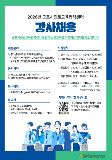 [뉴스다컴] (재)군포시청소년재단 군포시진로교육협력센터는 관내 청소년의 진로 탐색과 진로 역량 강화를 위해 '2026년 군포시진로교육협력센터 강사'를 채용한다고 밝혔다.