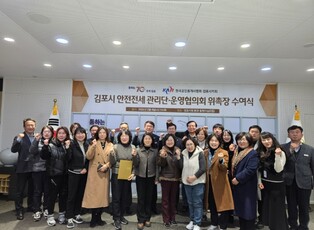 | ▲ 박승원 광명시장(사진 오른쪽)이 한우진 서울교통공사 토목처장과 ‘광명사거리역 내부 중앙계단 에스컬레이터 설치를 위한 기본 및 실시설계 용역 위수탁 협약서'를 들고 기념사진을 촬영하고 있다. |