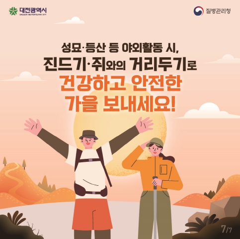 [뉴스다컴] 대전시는 성묘와 등산, 농작업 등 야외활동이 늘어나는 가을철을 맞아 시민들에게 진드기·설치류 매개 감염병 예방수칙 준수를 당부했다.