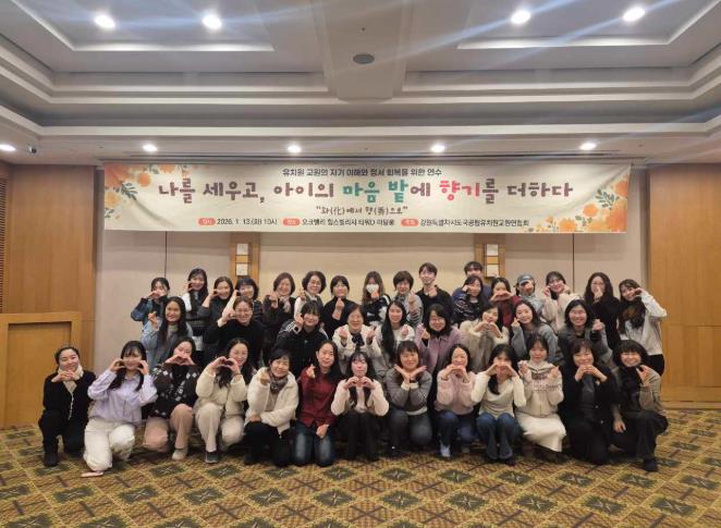 [뉴스다컴] 강원특별자치도국공립유치원교원연합회는 1월 13일 원주 오크밸리 힐스빌리지에서 유치원 교원의 정서 회복과 건강한 교육관계 형성 지원을 위하여 ‘나를 세우고, 아이의 마음 밭에 향기를 더하다’를 주제로 한 교원 연수를 운영했다.