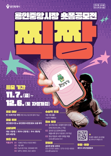 시 관계자는 “이번 숏폼 공모전은 시민이 직접 용인중앙시장의 매력과 전통문화를 재발견하고, 디지털 감성으로 전통시장 브랜드를 확산시키는 계기가 될 것”이라며 “청년들의 창의력으로 중앙동 도시재생 사업이 더욱 풍성하게 실현되길 기대한다”고 말했다.