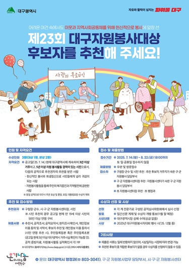 [뉴스다컴] 대구광역시는 이웃과 지역사회를 위해 묵묵히 헌신하며 따뜻한 변화를 이끌어온 자원봉사자를 발굴하고 그 공로를 인정하고자, 7월 14일부터 8월 22일까지 40일간 ‘제23회 대구자원봉사대상’ 후보자를 공개 모집한다.